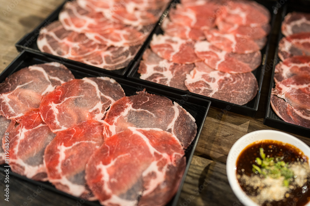 Various types beef and pork on tray hot pot ingredients. Close up