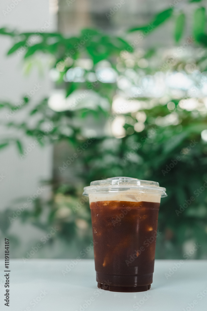 Selective focus of iced dark cold brew americano coffee on the plastic cup with blurred background, copy space in minimal cafe. Drink and Caffeine Beverage.
