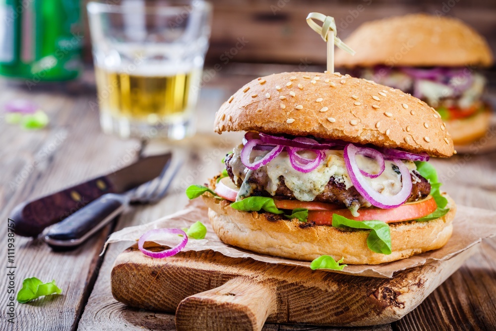 homemade burger with beef cutlet, apple, lettuce, onion and blue cheese