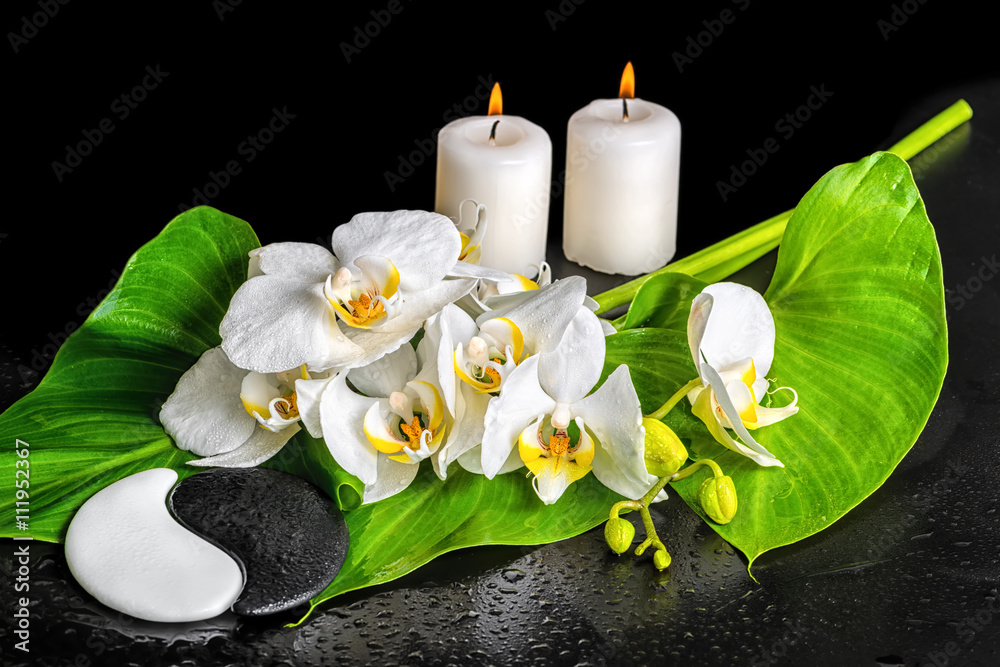 spa concept of orchid flower, phalaenopsis, leaf with dew, candl