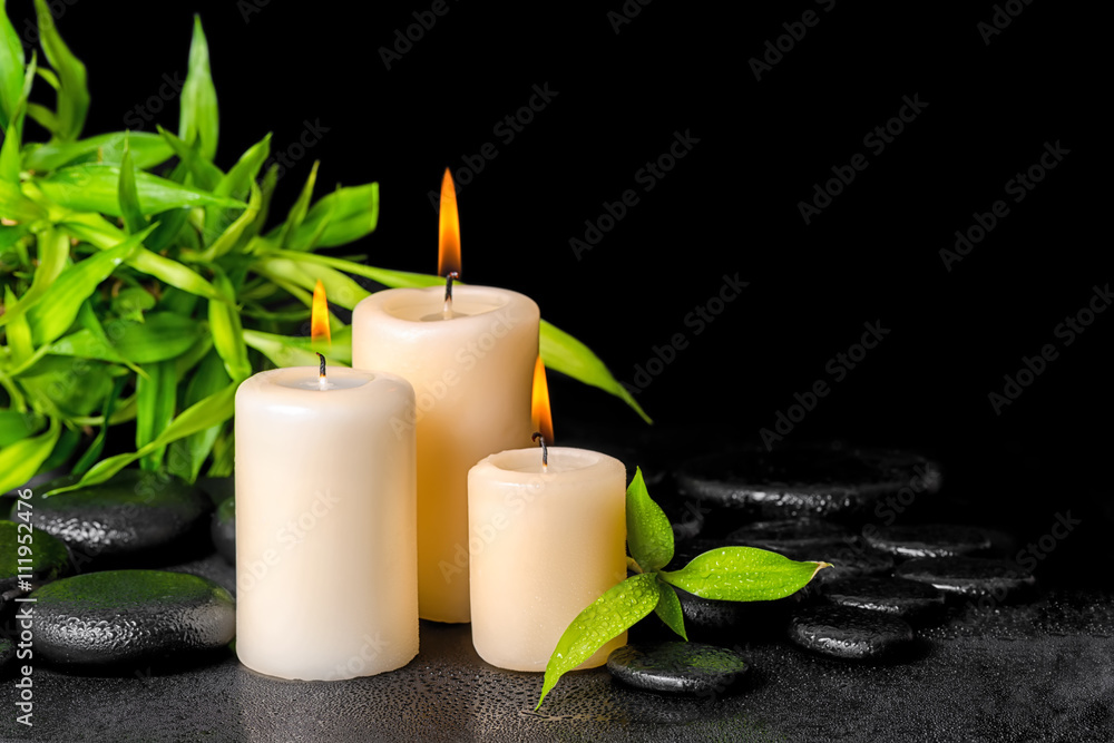 spa concept of twigs bamboo with dew and candles on zen basalt s