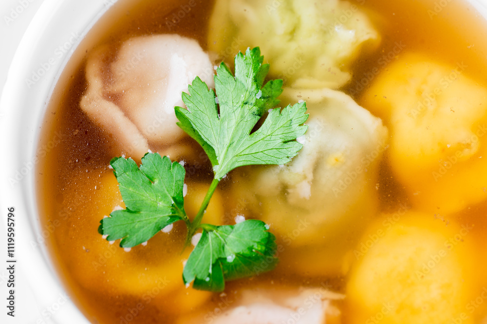 A close-up of a bowl of broth featuring assorted dumplings, including green and yellow variations. Fresh parsley garnishes the dish, enhancing its color and freshness.