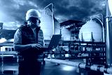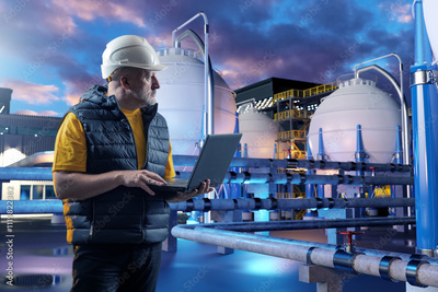 Man factory technologist. Engineer holding laptop. Spherical high pressure tanks behind man. Technologist industrial enterprise. Factory worker with computer. Factory technologist inspects pipeline