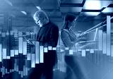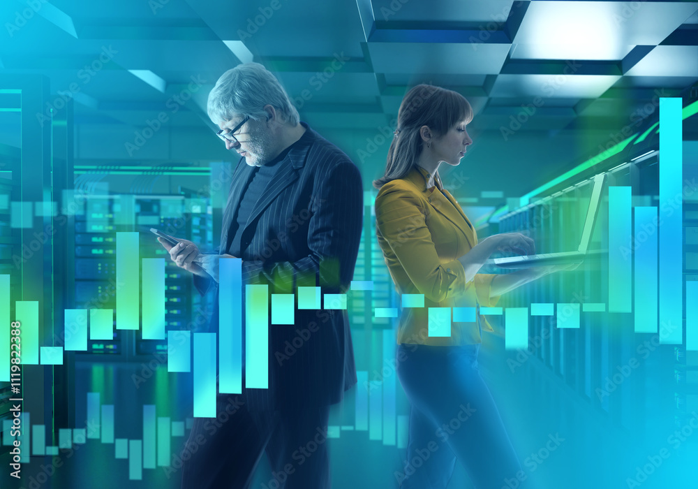 Analysts processing big data. Man and woman in server room. Data analytics with laptop and phone. Employees monitor load on servers. Data center managers. Two analysts near server equipment