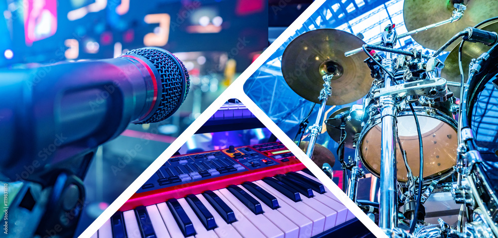 Musical equipment. Microphone near synthesizer. Drums lesson musician. Musical equipment for concert. Musical equipment on stage. Technique for group performing at concert. Music tech