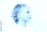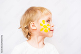 Beautiful child with hands in paint. Portrait of cute emotional kid. Close up of cheerful funny boy isolated on white background. Profile of blond caucasian baby with painted yellow sun on cheek.