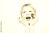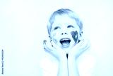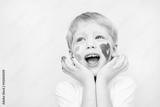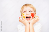 Beautiful child with hands in paint. Portrait of laughing emotional kid. Close up of cheerful funny boy isolated on white background. Baby with red heart and yellow sun on cheeks. Positive emotions.
