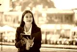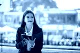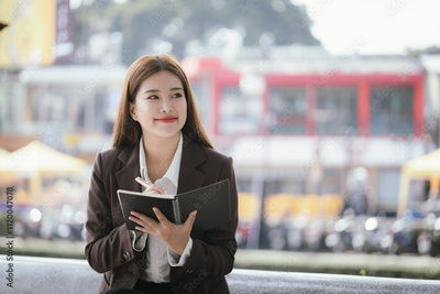 Confident businesswoman walks down a lively city street with laptop in hand. She exudes determination and success.