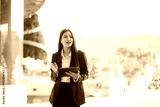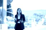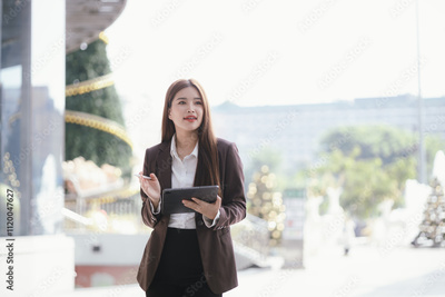 Confident businesswoman walks down a lively city street with laptop in hand. She exudes determination and success.