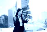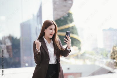 Confident Asian businesswoman standing on a busy city street with a smartphone in her hand, stylish and professional, representing the modern entrepreneur.