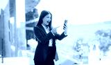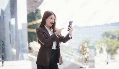 Confident Asian businesswoman standing on a busy city street with a smartphone in her hand, stylish and professional, representing the modern entrepreneur.
