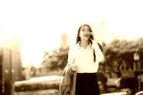 A businesswoman stands outdoors amidst a vibrant city, smiling while using her smartphone.