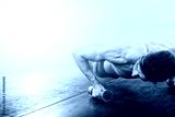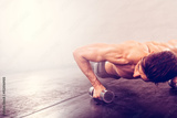 Man doing push-up exercise with dumbbell. Strong male doing crossfit workout.