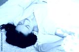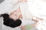 仰向けで目を閉じる美しい大人の女性 お昼寝や睡眠イメージ 緑の前ボケあり