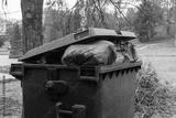 The trash can is clogged to the top, bags and waste fall out, cluttering up the surrounding area