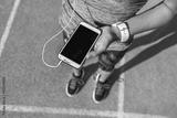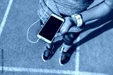 Runner girl holding smartphone using touchscreen for choosing music or texting sms on app before running on track. Female athlete woman feet and leg closeup with smartwatch and hand touching display.