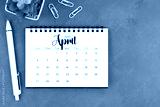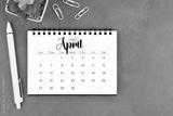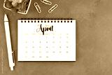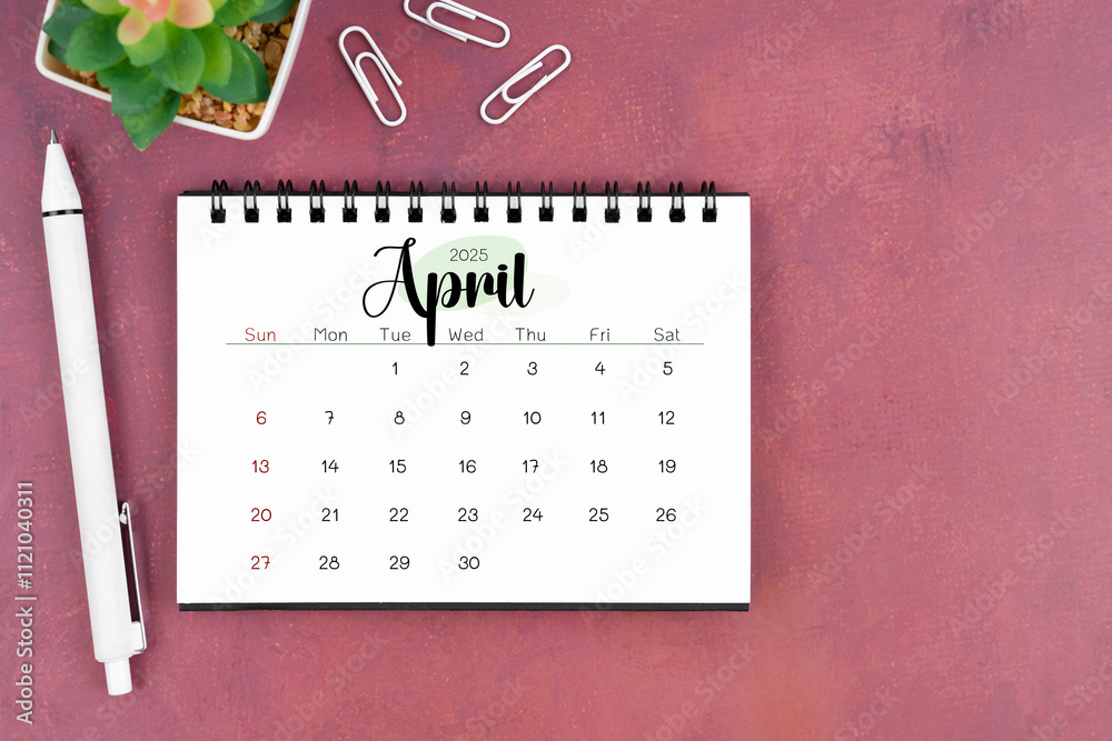 April desk calendar for 2025 year and pen on old red cover. Flat lay.