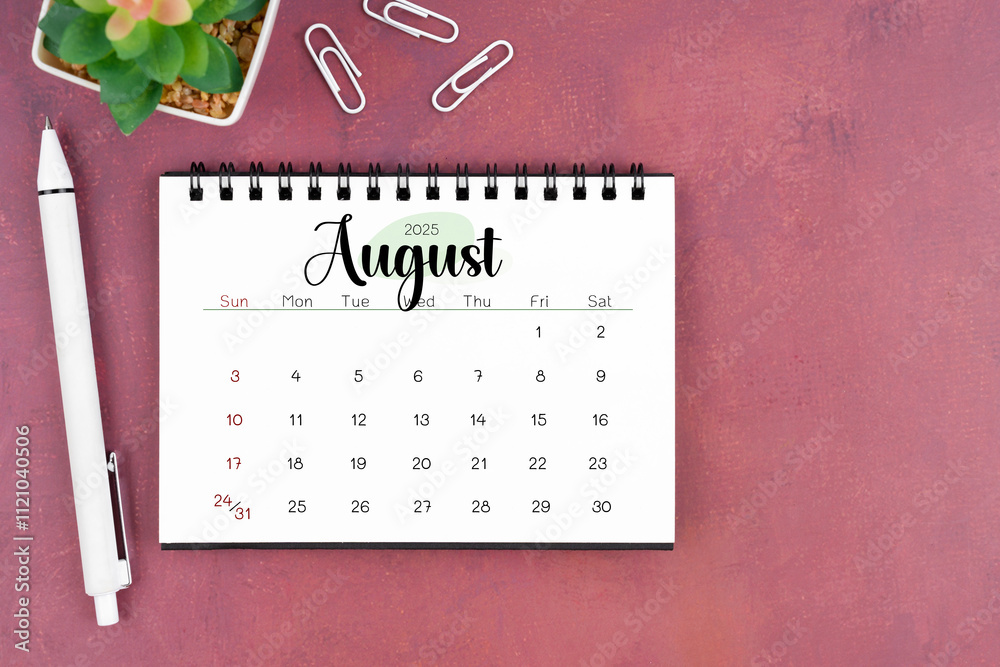 August desk calendar for 2025 year and pen on old red cover. Flat lay.
