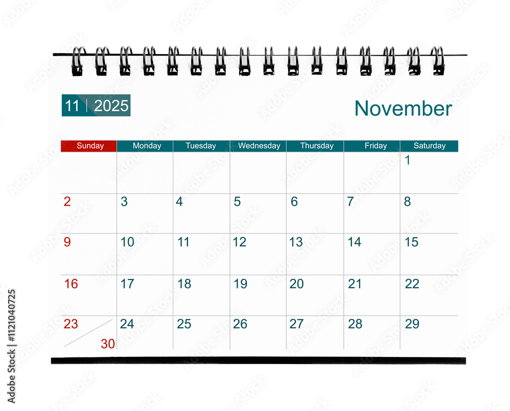November 2025 calendar. Page of the annual business desk month calendar isolated on white.