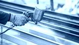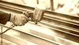 Construction worker painting metal structure surface coating with a spray gun at construction site. Metal corrosion and rust protection. Industrial precision. Protective coating to a metal structure.