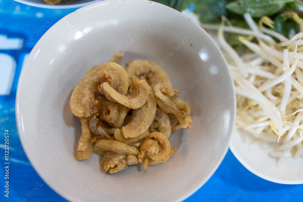 Pork rinds or deep fried pork skin in white bowl, eating with a topping with Thai noodle.. A delectable Thai culinary delight