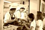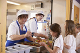 Two women serving food to a girl in a school cafeteria queue