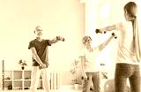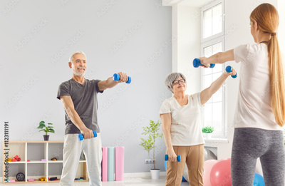 Two happy senior people having fitness workout with sports equipment and instructor. Smiling old man and woman standing in gym, looking at trainer and doing exercises with dumbbells