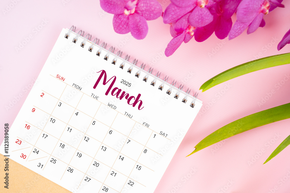 Desk calendar for March 2025 with blooming pink orchid. Flat lay.