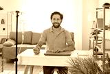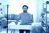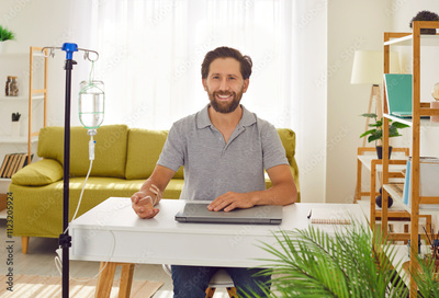 Portrait of happy bearded business man in casual T shirt sitting at work desk with laptop in home office receiving fatigue fighting, energy boosting and productivity increasing IV line vitamin therapy