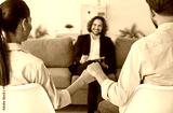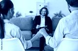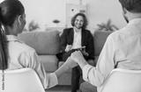 In a therapeutic consulting session, a positive psychologist warmly talking with family couple, promoting support and unity. The couple holds hands, symbolizing their shared union.