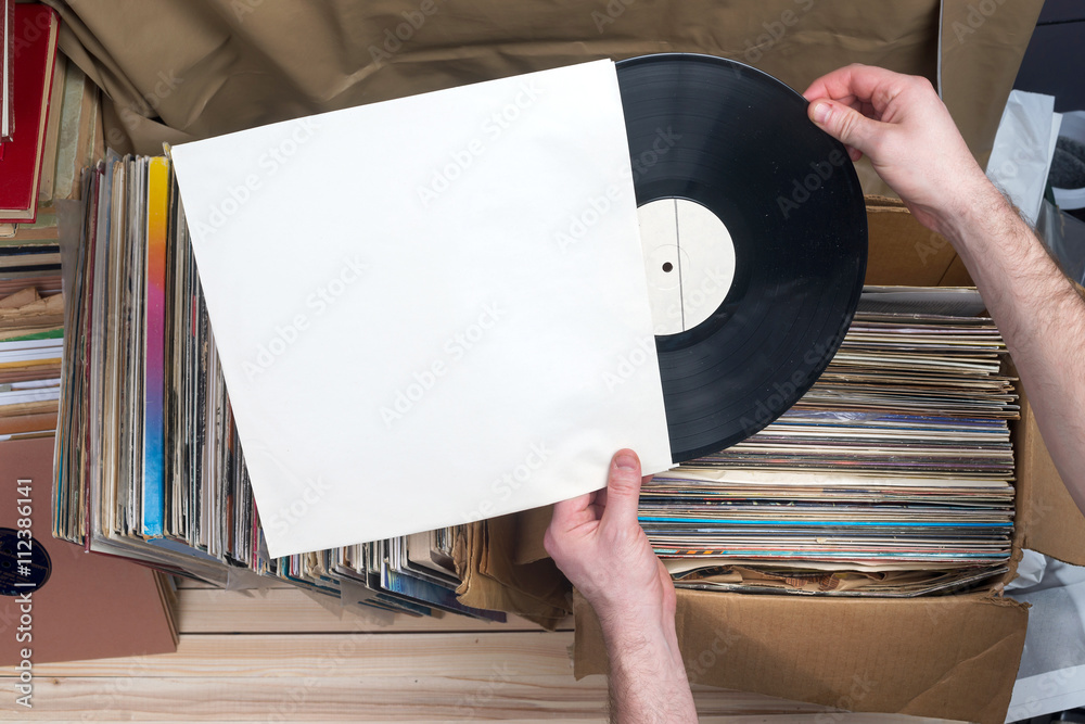 Browsing through vinyl records collection. Music background. Copy space. Retro styled image