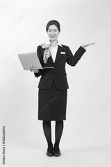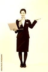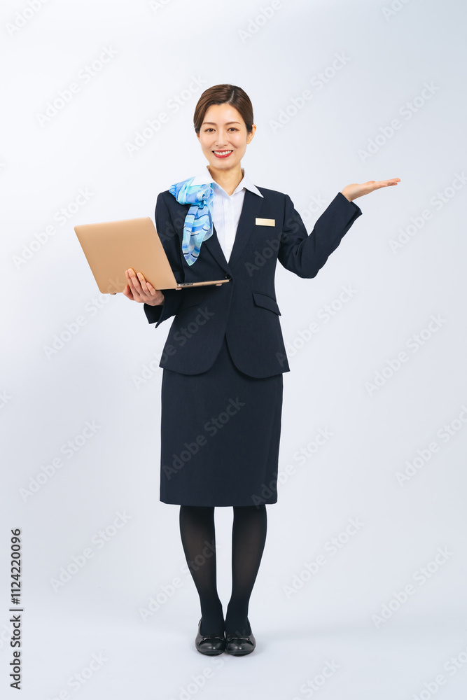 ノートパソコン、女性、ビジネスウーマン、全身、キャビンアテンダント、ビジネス、案内、紹介、おすすめ、キャンペーン、セール、受付、ガイド、PC、DX、日本人、ミドル、CA、コンパニオン、ホテリエ、ホテル、フロント、スタッフ、店員、インフォメーション、受付嬢、仕事、接客、お知らせ、告知、報告、誘導、見せる、提案、アドバイザー、セミナー、レクチャー、レッスン、研修、教育、広告、説明、写真、切り抜き、白バ