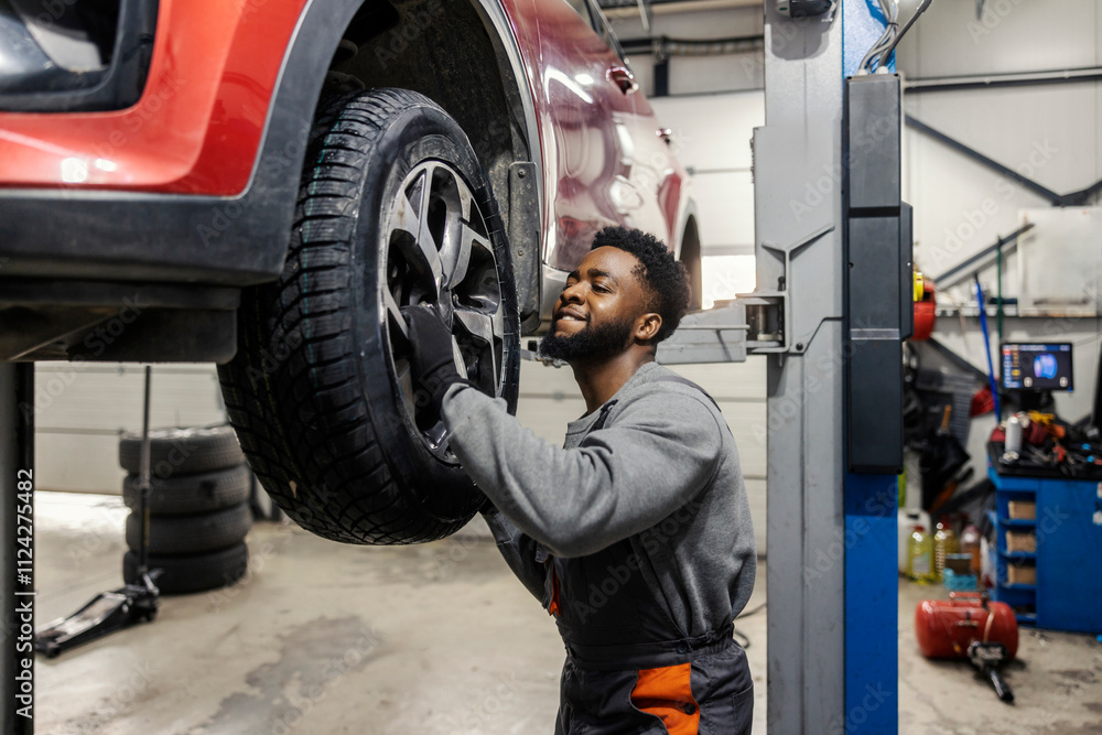 Hardworking multicultural car mechanic standing at car workshop and changing tires.