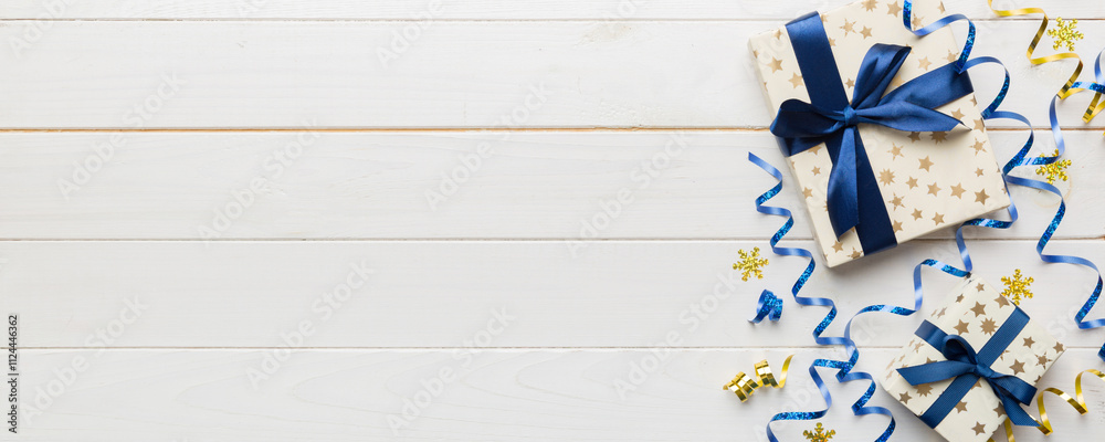 Holiday flat lay with gift boxes wrapped in colorful paper and tied decorated with confetti on colored background. Christmas, Birthday, Valentine and sale concept, top view