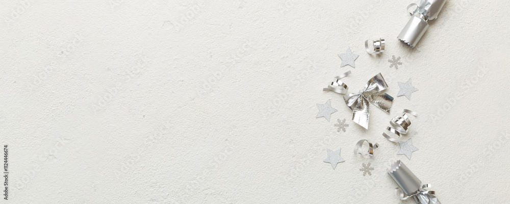 Christmas crackers with shiny confetti on color background, top view, copy space