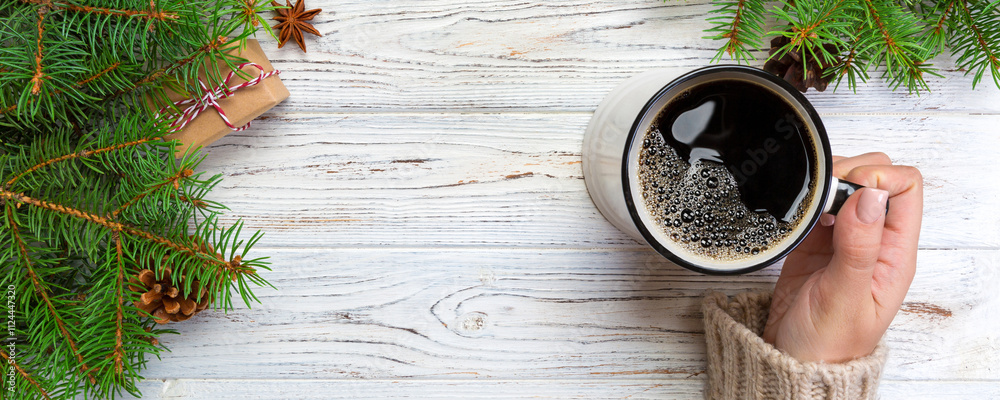 Woman holding cup of hot coffee on rustic wooden table. hands in warm sweater with mug, winter morning or christmas concept, top view