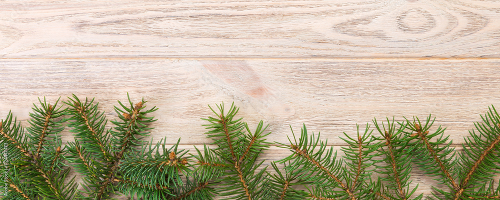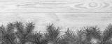 Christmas gray wooden background with fir tree and copy space. top view empty space for your design