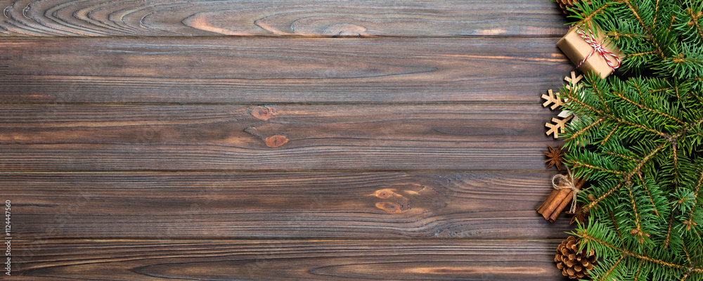 Christmas background with fir tree and gift box on wooden table. Top view with copy space for your design
