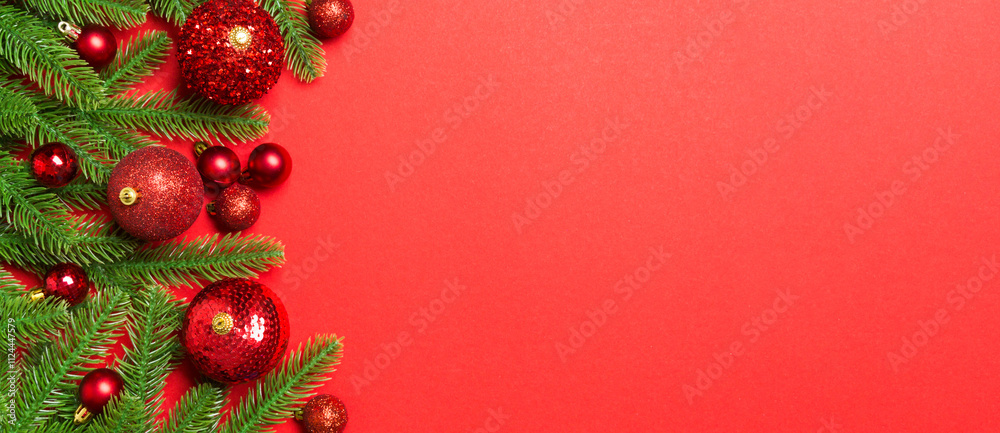 Christmas composition made of fir tree, balls and different decorations on colorful background. Top view of New Year Advent concept with empty space for your design