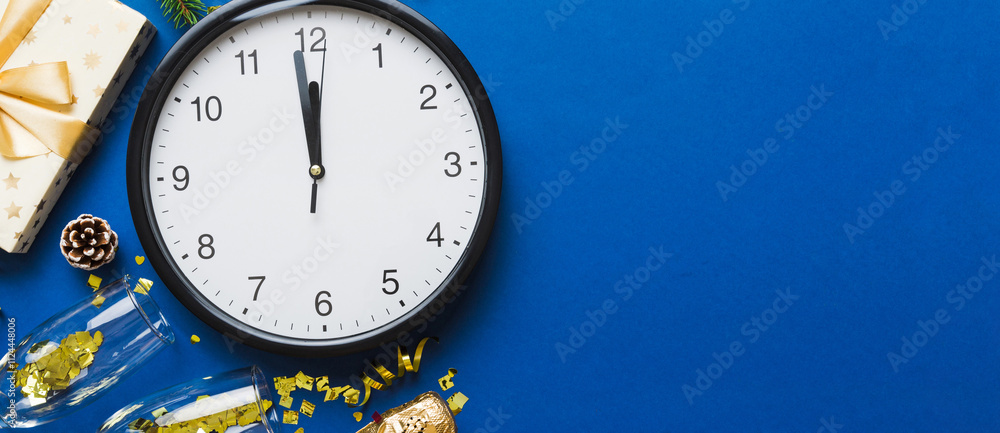 New year celebration concept with a bottle of champagne and two glasses toasting. Christmas gift box, alarm clock and fir tree branch on colored table. Top view Copy space