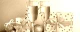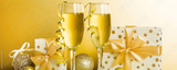 Champagne glasses and christmas decor on colored holiday background. Flat lay New Year decorations