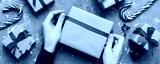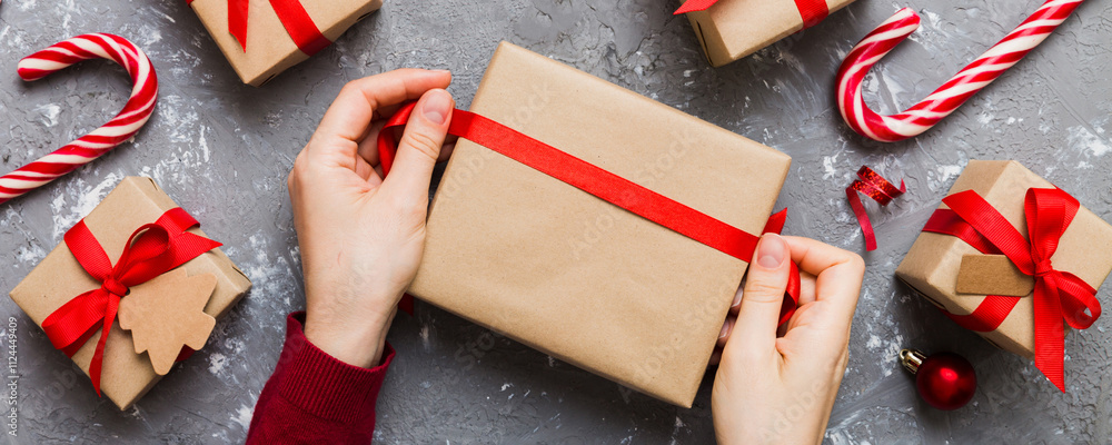 Woman is packing surprise gift for Christmas holidays, sitting at workplace with craft tools, top view. Woman wrapping Christmas gift at colored table