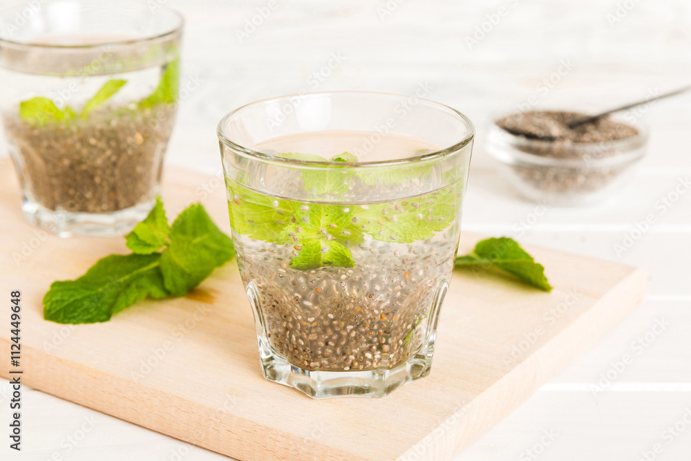 Healthy breakfast or morning with chia seeds and mint on table background, vegetarian food, diet and health concept. Chia pudding with and mint
