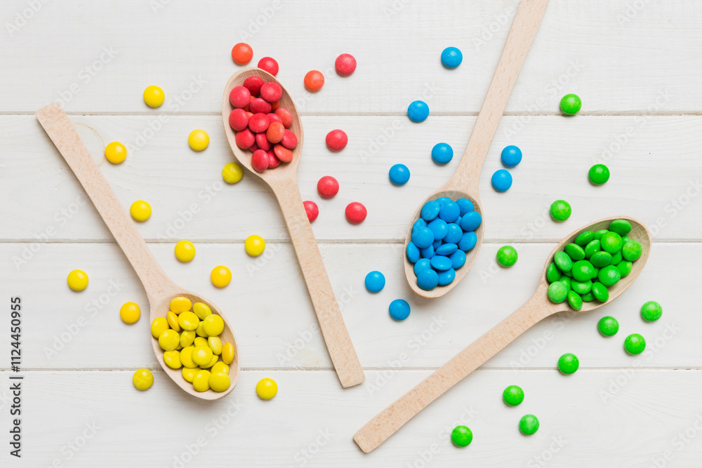 delicious colorful sweet candies on spoon on colored background . Confectionery decor top view with copy space