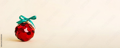 Christmas ball on colored background. decoration bauble with ribbon bow with copy space