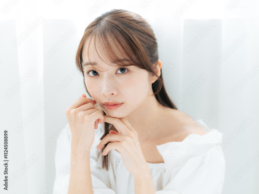 女性、美容、スキンケア、脱毛、コスメ、ナチュラル、透明感、日本人、ポートレート、ビューティー、ファッション、ホワイト、おしゃれ、カジュアル、明るい、爽やか、エステ、サロン、きれいめ、キレイめ、シンプル、清潔感、上品、清楚、美肌、美白、美顔、アンチエイジング、セルフケア、ニキビケア、UVケア、化粧品、メイク、ライフスタイル、オフショルダー、カメラ目線、若い、20代、素肌、コピースペース、カーテン、美