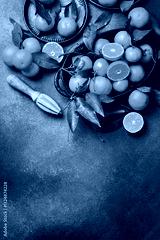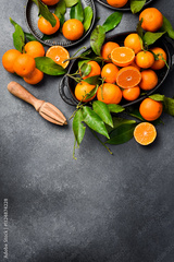 Tangerines (oranges, clementines, citrus fruits) with green leaves on dark textured background with copy space