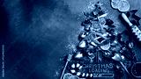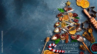 Christmas card with the inscription "Christmas loading". Christmas and New Year concept. Photo with cutlery and sweets.