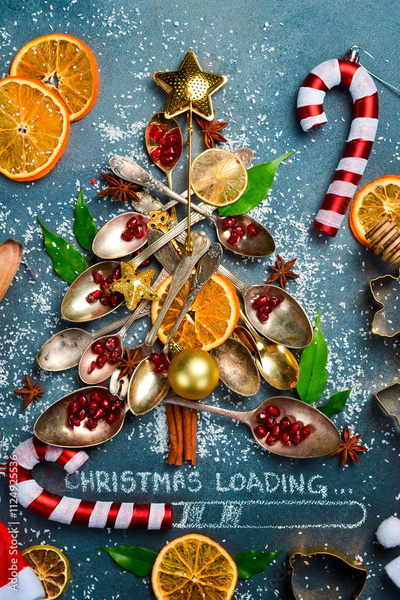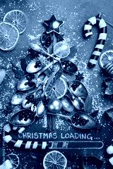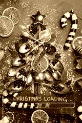 Vertical Christmas card with the inscription "Christmas Loading". Christmas tree made of cutlery.