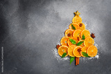 Christmas or New Year card. Christmas tree made of oranges. On a gray stone background. Top view.